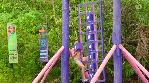 The immunity challenge is a classic contest of Chest Retrieval Spelling Bee Climb-A-Thon™, in which Simon proves his worth by climbing and spelling in slow motion.