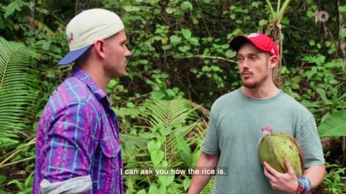 Simon and Harry are the two returnees on the Bounty Tribe, and Harry gives Simon instructions on how they’ll best work together. “If you say the rice is too crispy, that means Lyndl has the numbers. If you say it’s too warm, then Daniel is planning to backstab. If it’s mushy, they’re splitting the votes, but if it’s salty, trust no one. Unless it’s too salty, in which case, a new alliance was formed at the well. If I sneeze after eating it, play your idol.”