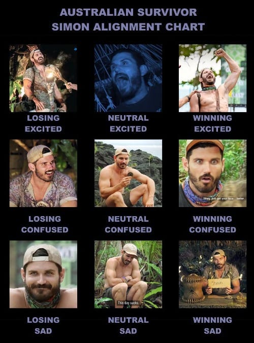 Simon is unsure what’s going on. “HOW’S THE RICE, HARRY?” he suddenly shouts at Tribal Council. He clears his throat. “I SAID ‘HOW’S THE RICE?’” And winks, before slapping his forehead. “OH, RIGHT! I’M SUPPOSED TO TELL YOU. IT’S, UH, PRETTY TASTY? IS THAT RIGHT?”
