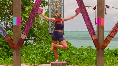 “No deal!” says Kass, who was frustratedly watching earlier as Deal or No Deal ran overtime, delaying the start of this episode. And she makes the idiotic ‘no deal’ gesture, but still somehow holds the beams up, thereby winning immunity and the Skrull, which she’s not allowed to open until next episode.