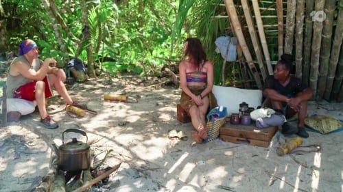 The Australia tribe return to camp, giddy with excitement having voted out the Golden God. George, in particular, is thrilled. He gathers Team Deicide™ (Kirby, Shonee, Sarah and himself) together, and declares that their new alliance name is ‘The Radical Atheists!’