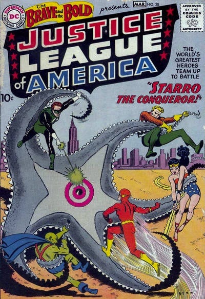 It’s the Justice League’s first appearance! They’re up against Starro, the original and best Justice League villain. Assuming you define ‘best’ as ‘most starfishy’. Starro’s a giant intelligent alien starfish who absorbs the brain power of humans by sticking starfish spores on their faces. So, y'know, evil and gross. The two entities face off to see who’ll triumph and get their own spin-off book that will spawn the Silver Age of comics. (Spoiler: it's the JLA, no thanks to Supes and Bats, who tap out of this adventure and instead leave the day-saving to an improbable finger-snappin’ teen named Snapper Carr!)
