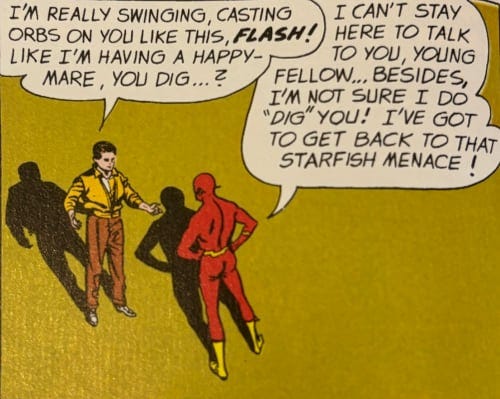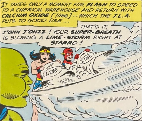 This is what kids of the 1960s were looking for in their comic book panels! Heroes emptying bags of lime, while other heroes blow it onto giant starfish from outer space.