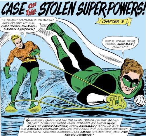 This is everything that’s good about comic books. Aquaman water-skiing via Green Lantern’s ring on the way to guard the oldest tortoise in the world from a villain who wants to steal its secrets to create an immortality serum. Also, look at Arthur’s one-handed form! That’s the King of the Seven Seas for you.