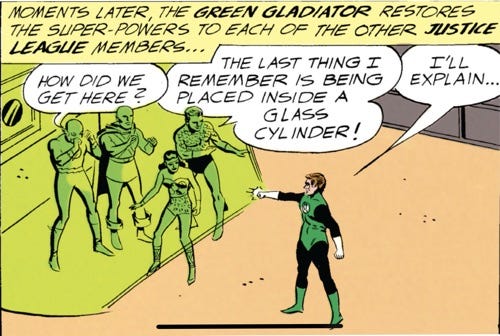 The Justice League discover their powers are all disappearing. “No problem for Batman!” chortles Aquaman, like a dick. “Bite me, Fish-Head,” retorts Batman. They’re being stolen by Amazo, an android created by the villainous Professor Ivo who possesses the ability to duplicate the powers of the Justice League, something not even the latest iPhone can do. Bizarrely, Amazo's crime spree with these stolen powers revolves primarily around animal theft. Luckily, quick thinking from Green Lantern (!) saves the day and Amazo is deactivated and kept in the JLA trophy room.