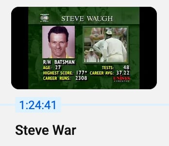 This is also excellent. Oh, sure. Some Australians might take great umbrage at this erroneous spelling. They might even call it a Steve War crime. Not me. At this stage of his career, Steve ‘Senior’ War did not deserve respect to be shown to his name. Look at that career average. Sort it out, get it above fifty, and we’ll talk, Steve.