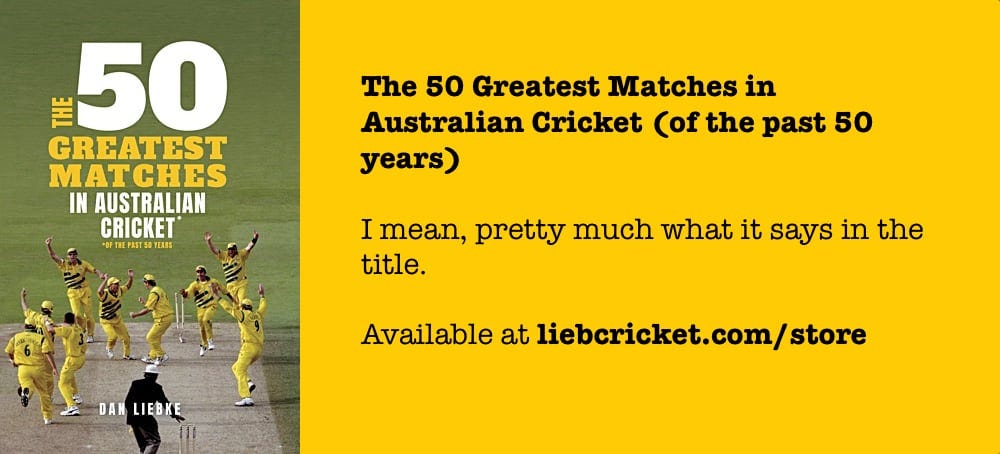 Great Test, though. It even cracked the top ten of my 50 Greatest Matches in Australian Cricket (of the Past 50 Years) when I wrote that book in, oh, let’s say, 2019.
