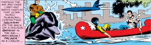 An amazing panel, as various members of the JLA are summoned to the case. First, you’ve got Aquaman, riding a dolphin like a complete dick. The fish (and, yes, yes, water-based mammals) are his friends, people! How often do you force your friends to carry you around on their back?