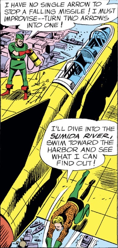 It’s Aquaman! While that panicking buffoon, Green Arrow, is bemoaning his criminal lack of foresight in not previously designing a falling-nuclear-missile-catching arrow, Arthur is sensibly bailing, straight into the nearest river. ‘Good luck with the nuke, Ollie!’