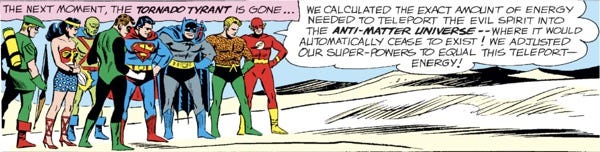 It’s The Tornado Champion, I guess. Because even though this looks like the JLA gathering together at issue’s end, with Flash cobbling a deus ex meteorologica explanation for how they sent a tornado to another dimension, it is, in fact, an explanation offered by a different tornado disguised as the Justice League. How, again, does the twister accomplish this, you might ask? And, once more, the writers of this book remind you to shut up!