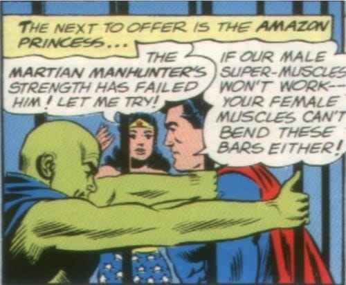 It’s Wonder Woman who, somehow, doesn’t spend the remainder of the issue berating Clark for this gross sexism. Yes, the team are struggling to break free of a jail cell because they’ve been brainwashed into believing they can’t. And, yes, it’s the 1960s. But she’s still an Amazon fucken princess, dude. Give her a shot at it.