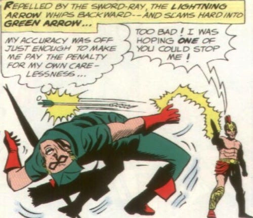 A wonderful panel on several levels. For one thing, the entire purpose of Green Arrow is to have perfect accuracy with his archery. If he can’t do that, what’s the point of him? For another, I love Terrane (that’s this dude’s name) mumbling disappointedly to himself about what a shame it is that’s he’s too awesome a fighter to be defeated. Ugh. Hate that. And, finally, of course: sword rays! Yes!!