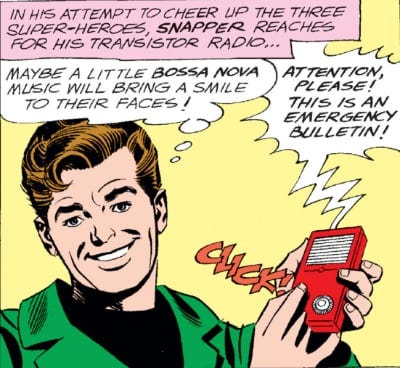 Speaking of that nitwit Snapper, here he is, trying to cheer up Wonder Woman, Green Arrow and Aquaman by playing bossa nova music on his transistor radio. What a creep.