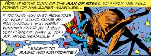 It’s Superman, who is not only the first to learn about the off-planet doom machines, but also does the bulk of the work in wrapping up that problem, before returning to Earth and singlehandedly beating up the spaceship-emulatin’ metal alien, as well. Heck, he even takes valuable time out of this climactic battle to remind readers of his weaknesses of magic and kryptonite. Really making the rest of the team look like a bunch of Snapper Carrs, Clark.