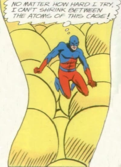 It’s The Atom from Earth-One, whose understanding of quantum mechanics is tested to its very limits by all these atoms smooshed together. Look at them! Hate it when that happens.