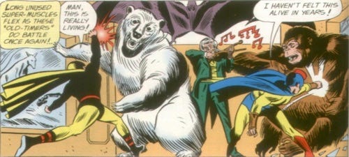 Look at this panel! Just look at it. Hourman and the Earth-2 Atom remarking out load about how delighted they are to be engaging in fisticuffs with a gorilla and a polar bear brought to life by the violin-playing of a master criminal. Close runner-up to this superb panel is the very next one, which sees The Fiddler also summon a pterodactyl and a kangaroo into the fray (this is not a joke). Comic books! The greatest medium of them all.
