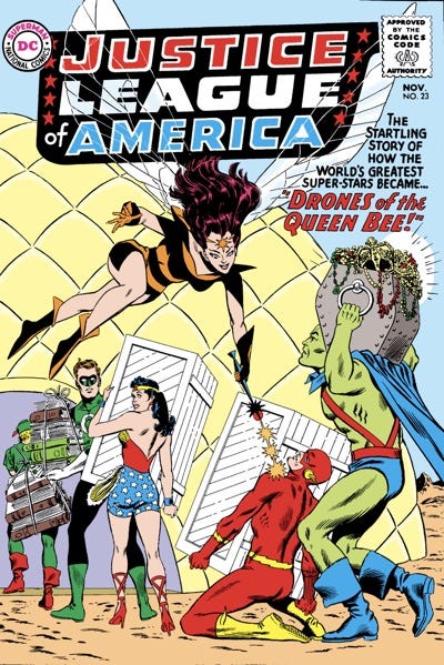 All members of the team incapable of concocting an excuse have gathered in JLA headquarters to celebrate Snapper Carr passing his exams (what does Snapper study, you might ask? He is pursuing a Bachelor of Ridiculous Jive Linguistics, and you can tell he’s doing well, because in his very first panel he refers to his ‘tardy card’ and calls a cake a ‘flour tower’). Luckily for all in attendance, the ‘festivities’ are interrupted by news of a spate of robberies by alien bee-men! Flash, Green Lantern, Wonder Woman, the Martian Manhunter, and Green Arrow charge off to put a stop to this insect crime spree, only to find themselves captured by their Queen, Zazzala of the planet Korll, who blackmails them into finding an immortality serum invented by ‘a bee man genius’ named Per Kazz. The quintet dutifully head off to track down the chemicals needed to create this serum, inexplicably protected by a lava monster, triffids and a glacier chess board? They magnetise, weed and checkmate the various opponents respectively, and return the chemicals to Zazzala, who permits them to return to Earth and Snapper’s party. ‘Ugh. Can’t we stay here?’ says J’onn. And when Zazzala says no, they tighten the vials of chemicals so tight she can never open them up. Or something. A fitting revenge.