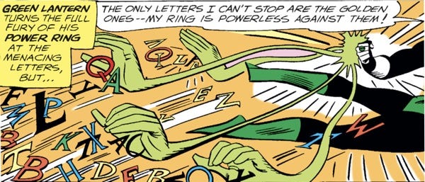 One of the robberies taking place sees Zazzala’s bee-men stealing important literature and, in the process, removing the embossed letters from the covers of books! It’s wonderful nonsense, improved immeasurably by Hal’s stupid old power ring once again being incapable of specifically stopping the yellow ‘menacing letters’ and needing a rescue from Green Arrow, of all people. Superb stuff.
