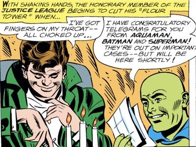 It’s a three-way tie between Aquaman, Batman and Superman, who’ve all feigned important cases that allow them to miss Snapper’s party. Frankly, Arthur’s the one who deserves the most credit here. Bruce and Clark have a convincing track record of ongoing adventures worth reading. But what’s Arthur claiming? ‘Oh, I have some kelp to check on’? (Atom also misses the party, but is forced to fight Doctor Light in an issue of his own book (issue 8, editor Julie Schwartz desperately informs us, as if we’d care), and that’s barely better.)