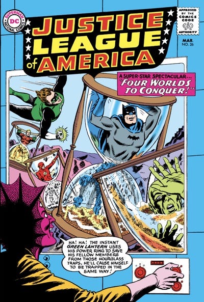 First issue JLA villain Despero is back, with a plan so cumbersome it requires parallel worlds, accelerated ageing technology, and the audacity to impersonate Superman and hope nobody asks too many questions. Great stuff from a great alien troublemaker. He starts with the ageing, using his mental powers to send Green Arrow, the Atom, Wonder Woman, and Snapper Carr prematurely into their twilight years. As that lot shuffle aimlessly around JLA HQ, trying to remember Taylor Lautner’s name and demanding to speak to Julius Schwartz, Despero pivots his attention to Batman, Martian Manhunter, Green Lantern, Aquaman and Flash, sending them off to evolutionarily divergent parallel worlds that Despero himself has created, just so that he has extra vanquishing duties. A conquerholic, yes, but at least he’s proactive, unlike infamous crybaby Alexander the Great. If there are no more worlds to conquer, AtG, don’t be weepin’ about it, bruh. Tamper with space and time itself to create some more! Still, it obviously doesn’t work, with the heroes leading those worlds into defeating Despero’s conquering ways. So, running low on options and brimming with the kind of desperation his name implies, our alien villain dons an old-man wig, an ill-fitting leotard and cape, and introduces himself to the team as Superman. Wonder Woman, octogenarian af and absolutely not in the mood, magic lassos him, and the whole mad scheme swiftly unravels from there.