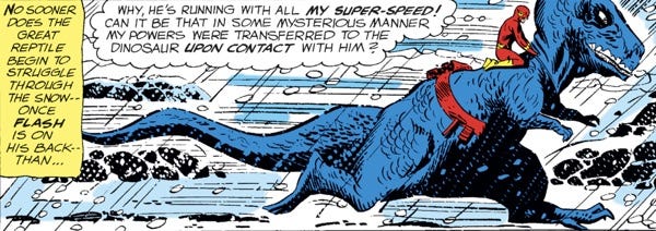 People think comic books are for children, and yet, here’s the Flash riding a friggin’ dinosaur through the snow, like some kind of alien planet Jurassic Park Santa Claus. What the hell have you done, naysayers?