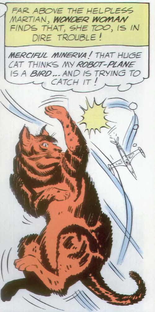 It’s Wonder Woman, who has to put up with an enlarged cat trying to swat her invisible jet out of the sky. How can the giant cat see the invisible jet? You shut up.