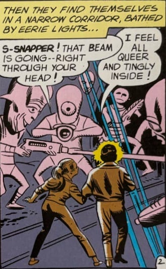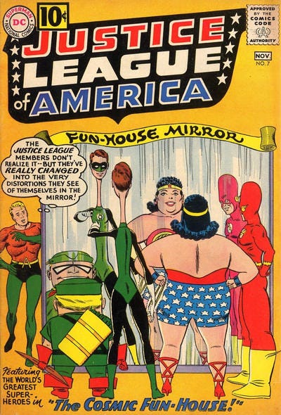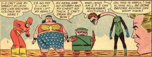 Aliens of the planet Angellax have taken over a Happy Harbor funhouse, as you’d expect, attracting the attention of our heroes after foolishly teleporting JLA mascot and sprouter of teen gibberish Snapper Carr halfway across the galaxy. For reasons that elude the casual reader, the team decide to infiltrate the funhouse in their civilian secret identities and are swiftly captured and impersonated as a result. Luckily, renowned merperson Aquaman is shamefully lacking in a civilian identity and therefore springs into fishy action, improbably saving the day for landlubbers everywhere.
