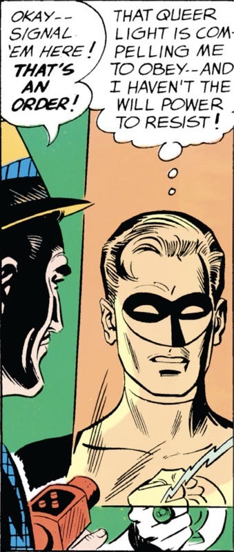 The whole deal with Green Lantern is that he possesses almost unlimited willpower. What’s going on here, Hal? I mean, the ray’s not even yellow, bruh.