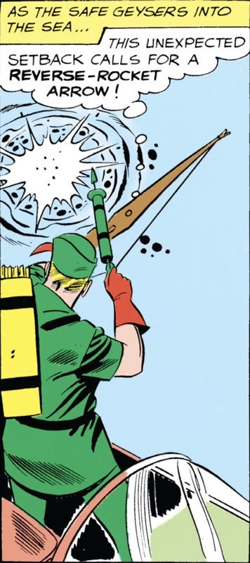 It’s Green Arrow, who not only recognises that an unexpected setback calls for something called a ‘reverse-rocket arrow’, but also happens to have one on hand. (Having said that, is this a case of ‘if all you have is a reverse-rocket arrow, then every problem looks like a reverse-rocket-requiring nail?’ Perhaps.)