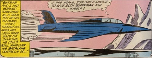 It’s ol’ Diamond Arms and Legs Batman, who overcomes a sudden case of engagement ring limbs (to use the proper medical term) to pilot the Batplane to the rescue of that Kryptonite-suffering fool, Superman.