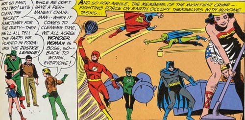 Who’s in charge of cleaning in the 1960s? The lone girl in the team, obviously. Nevertheless, she’s got those lads working hard. Although I have no idea why Batman’s moving that desk in such a weird way.