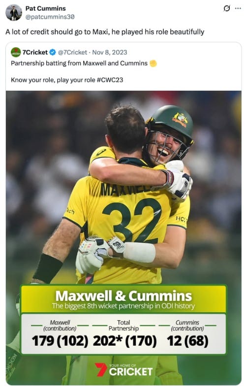 Against Afghanistan in the 2023 ODI World Cup, with Australia 7/91 in the nineteenth over, still 200 runs shy of Afghanistan’s 5/291, Maxwell was joined by his captain Pat Cummins.