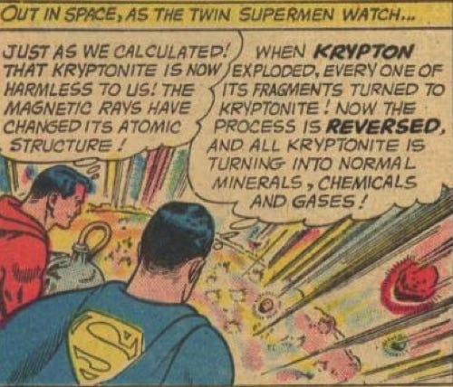 If Krypton’s explosion turned the planet into millions of shards of deadly kryptonite, then why not simply reverse the polarity of that explosion and unexplode the kryptonite back into the planet? Obvious, in retrospect. Boy, that single version of Superman must feel like an absolute knucklehead.
