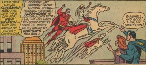 It’s Comet the Super-Horse! Why isn’t Comet affected by Krypton’s red sun? Uh, because he’s a former centaur, enchanted by a witch to not only have a variety of superpowers, but also able to switch between human and horse form (a kind of were-centaur, I guess), but only while a comet passes through the solar system, obviously. And, yes, this isn’t spelled out in the panel - we kids were just expected to know this shit. And we did. And we loved it.