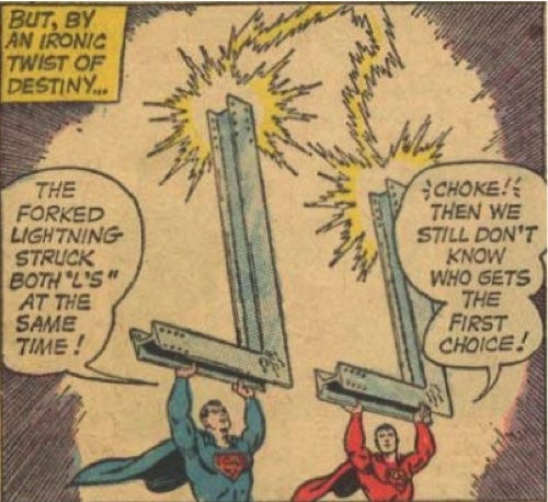 Unable to decide who gets first choice between Lois and Lana (do the ladies get a choice which Superman they prefer? Ha ha ha! Of course not), our twin heroes solve the problem in the same way you or I would. Namely, by constructing a pair of Ls (for Lana Lang and Lois Lane) and allowing a bolt of lightning to determine who picks first. Tossing a coin is for suckers.