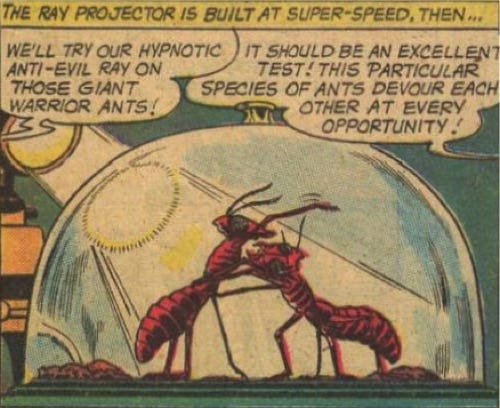 Ant testing complete, the pair blanket the Earth with a series of anti-evil ray satellites, ending all wars and altering the minds of ne’er-do-wells, most notably Lex Luthor, who celebrates this brainwashing by pledging his life to science, starting with a cure for baldness! (Oh, and every other disease too.)