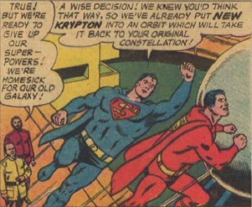 After a protracted meeting of the greatest minds of the newly restored planet Krypton, the Kandorian inhabitants tell Superman-Red and Superman-Blue they want to return to their original galaxy, even though it means that they’ll lose their incredible superpowers. “Knew you would!” is the dismissive response of the two Supes, whose know-it-all condescension is really starting to crank up, big time.