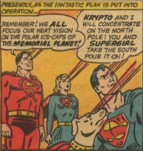 It’s Krypto! Yes, long before he was an adorable good boy star of various trailers, teasers and upcoming Superman movies, Krypton’s finest superdog was always on hand, ready to help Supes with whatever mad scheme he’d come up with. In this case, melting the ice caps of a memorial planet so that it will be covered in water for Atlantean mermaids to go live on. Sure, mate, whatever you say.