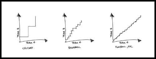Cricket’s great cousin, baseball, of course, also has similarly delineated innings in which the sides take it in turns at bat or in the field. In terms of asynchronous team sports, baseball is definitely far closer to the cricket end of the spectrum. However, with these innings being both shorter in length and more numerous than cricket innings, we’re beginning to take baby steps towards the simultaneous end of the spectrum. Baseball players will swap roles nine times in an afternoon. A cricket team could be stuck in the one role for days on end.