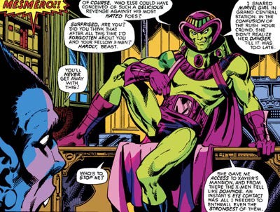 Back in the tent, Beast tries to convince Jean that she’s not a circus freak, but rather an Uncanny X-Person™! Jean doesn’t buy a word of it. And nor does Scott when he pokes his inevitable fool head into the conversation. As with any conversation involving more than two mutants, the whole thing escalates into a scuffle and eventually Beast ends up fleeing for his idiot furry blue life from a passing gang of circus toughs. Eventually they capture him and take him to villain of the issue, Mesmero, who is man-spreading like nobody’s business. Beast, dumbstruck by Mesmero’s overt crotchal display, falls immediately under his thrall. They don’t call him Mesmero for nothing, people.