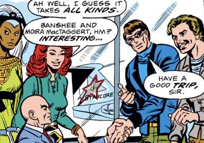 Professor X has decided he needs a vacation to escape from all the X-stress he’s been experiencing. “What kind of X-stress?” asks Maid Moira, who knows on which side her pay cheque is buttered. “Well,” says The Professor. “For one thing, I keep having bizarrely detailed space operatic dreams. And then there’s Nightcrawler, who insists on goofing around with something called an ‘image inducer’. And, finally, there’s some prescient clown in the letter column suggesting (without a skerrick of irony) that maybe this new ‘Wolverine’ character should ‘eventually get some time in the limelight’.” Yowsers! It’s all too much for Chuck, so he heads to the airport to catch the next flight away from this issue.